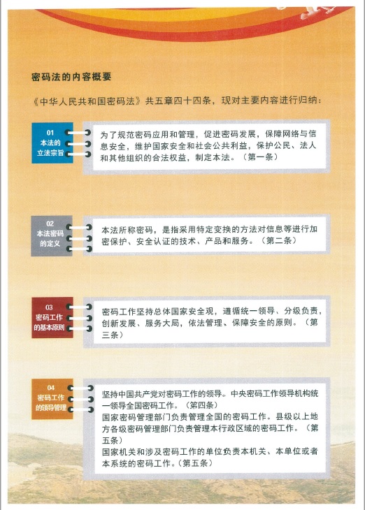 第十条 国家采取多种形式加强密码安全教育,将密码安全教育纳入国民教育体系和公务员教育培训体系,增强公民、法人和其他组织的密码安全意识。